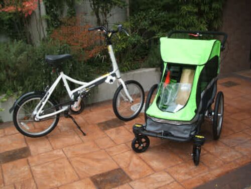 自転車とベビーカーを組み立てた。 自転車は20インチのミニサイクル、ベビーカーは二人乗りの4輪タイプ。 この二つが合体して子供乗せ付き3輪自転車にヘンシ~~ン ハンドルに連動して前2輪(=ベビーカーの後2輪)が動き、ブレーキレバーは前2輪のドラムブ…