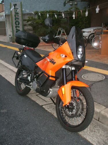 お客さんが排気量が1000ccもあるオフ車のような巨大なKTMに乗って来られた。 またがらせてもらったら、両足バレリーナ状態。