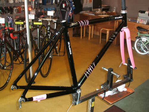 い~さんの「ZULLO・PANTAREI」をガラスコーティング。 製作はイタリア、塗装は日本のフルオーダークロモリロード。 アルミのような太めのパイプ、フォークはカーボン。 ブラック&ピンクの塗装表面はとても滑らかな仕上がりで、エンドとハンガー部の肉抜き…